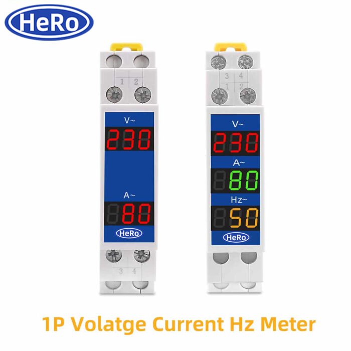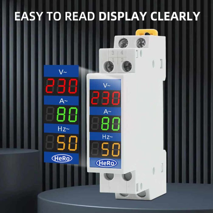 This compact digital voltmeter ammeter is designed for DIN rail mounting with an 18mm width. It supports wide voltage input from 80V to 500V AC and current monitoring up to 100A. Ideal for monitoring power systems in homes, industrial setups, and solar installations. It also includes frequency measurement (Hz) and LED digital display for clear and immediate readings.